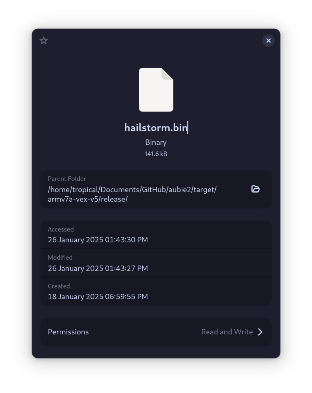 A breaking change to Rust’s target specification schema broke vexide builds on newer versions of Nightly Rust. That is now fixed in cargo-v5 0.10.0, along with some issues regarding file removals and the program terminal when connected through a controller.